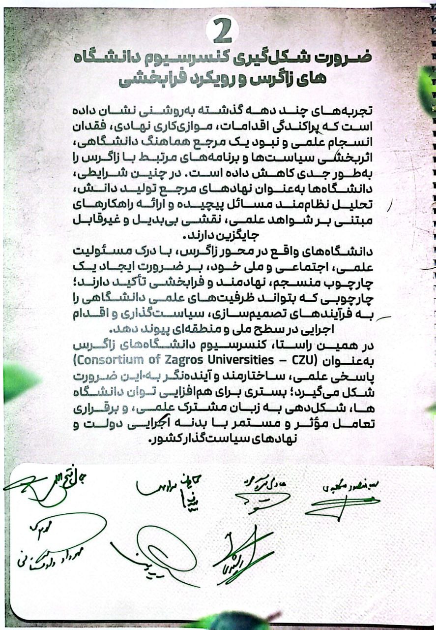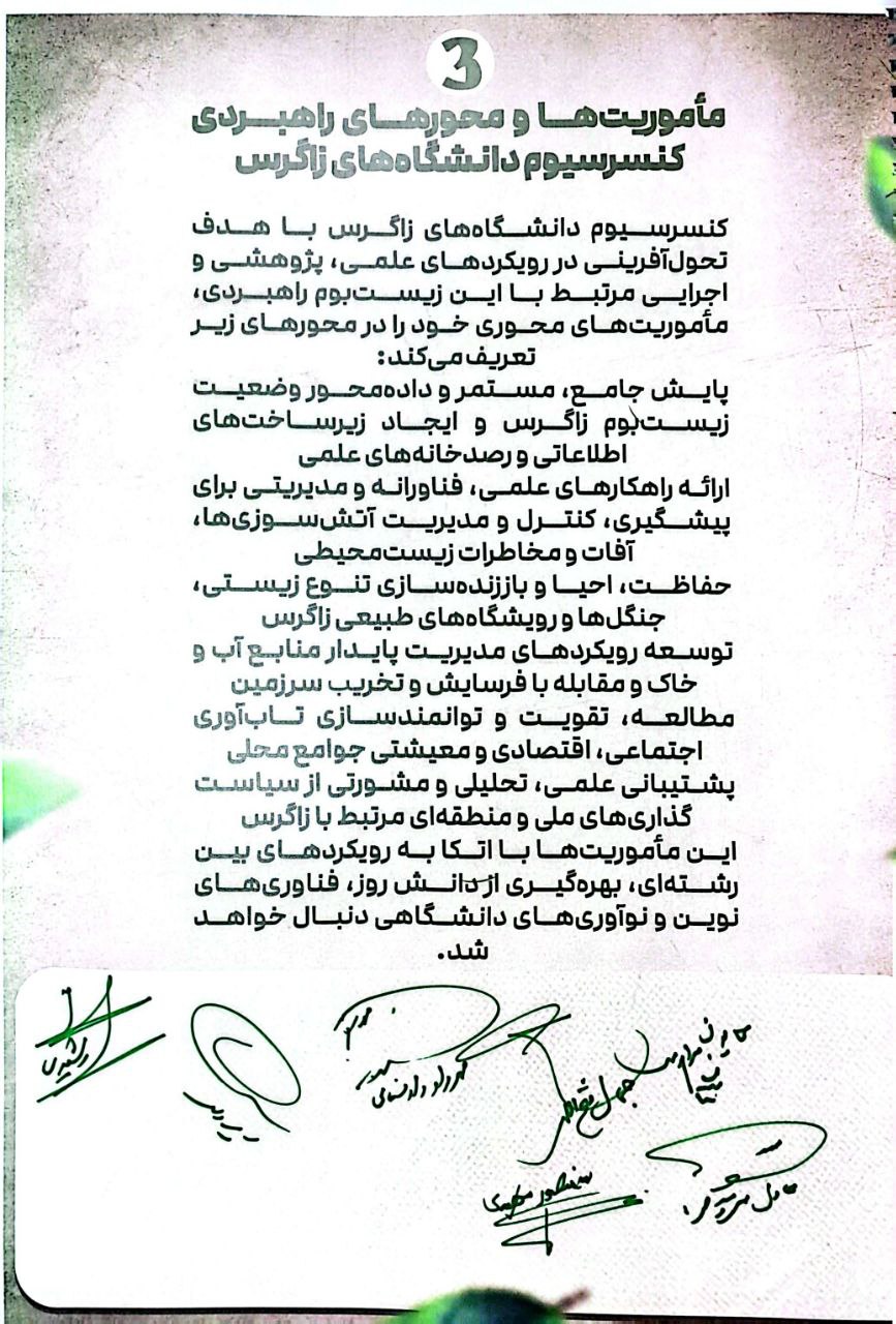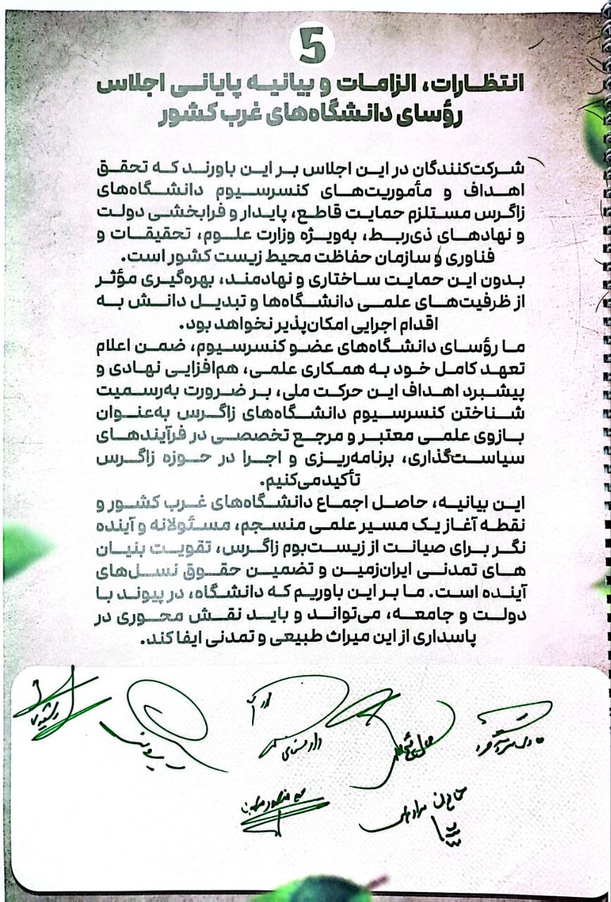 این بیانیه حاصل اجماع دانشگاه‌های غرب کشور و نقطه آغاز یک مسیر علمی منسجم، مسئولانه و آینده‌نگر برای صیانت از زیست بوم، زاگرس، تقویت بنیان‌های تمدنی ایران زمین و تضمین حقوق نسل‌های آینده. است ما بر این باوریم که دانشگاه، در پیوند با دولت و جامعه میتواند و باید نقش محوری در پاسداری از این میراث طبیعی و تمدنی ایفا کند.