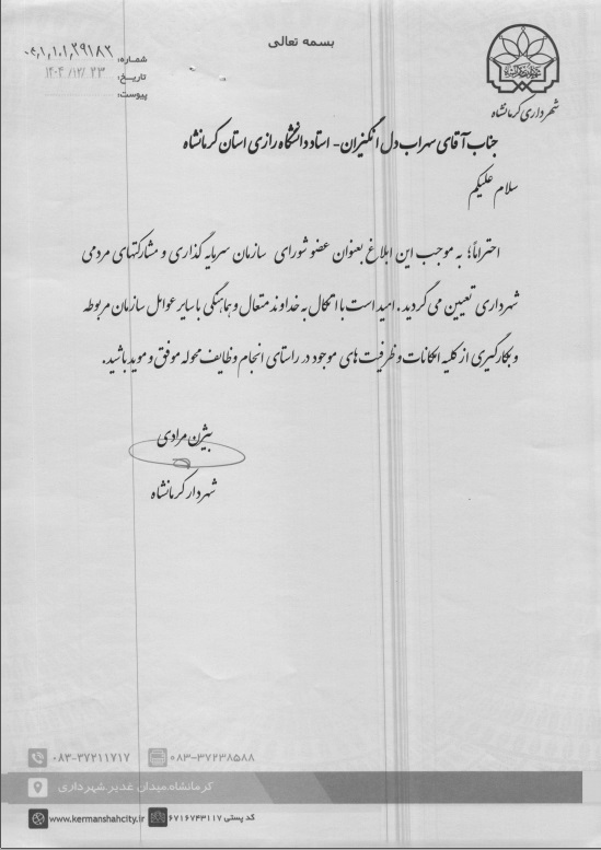 عضویت دکتر «سهراب دل انگیزان» در شورای سازمان سرمایهگذاری و مشارکتهای مردمی شهرداری کرمانشاه - پرتال اصلی دانشگاه رازی