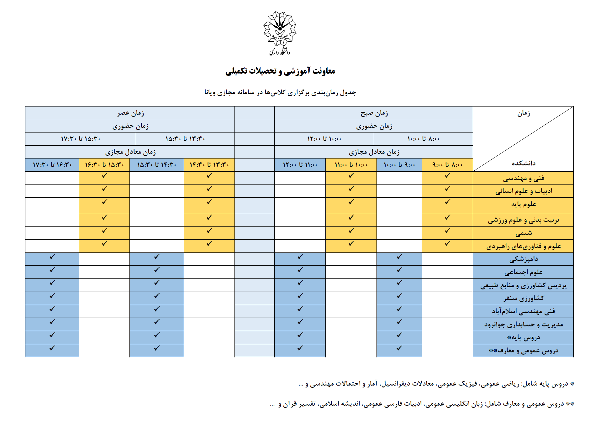 به اطلاع کلیه استادان محترم و دانشجویان گرامی می‌رساند که کلیه کلاس‌های آموزشی دانشگاه، از روز شنبه مورخه ۱۴۰۵/۰۱/۱۵، در بستر سامانه مجازی ویانا و بر اساس جدول زمانبندی زیر تشکیل می‌گردد. در صورت تمایل استادان محترم، به تشکیل کلاس با بازه زمانی بیش از یک ساعت، ضروری است که زمان مازاد را پیش از زمان ارائه شده در جدول زیر لحاظ نمایند.