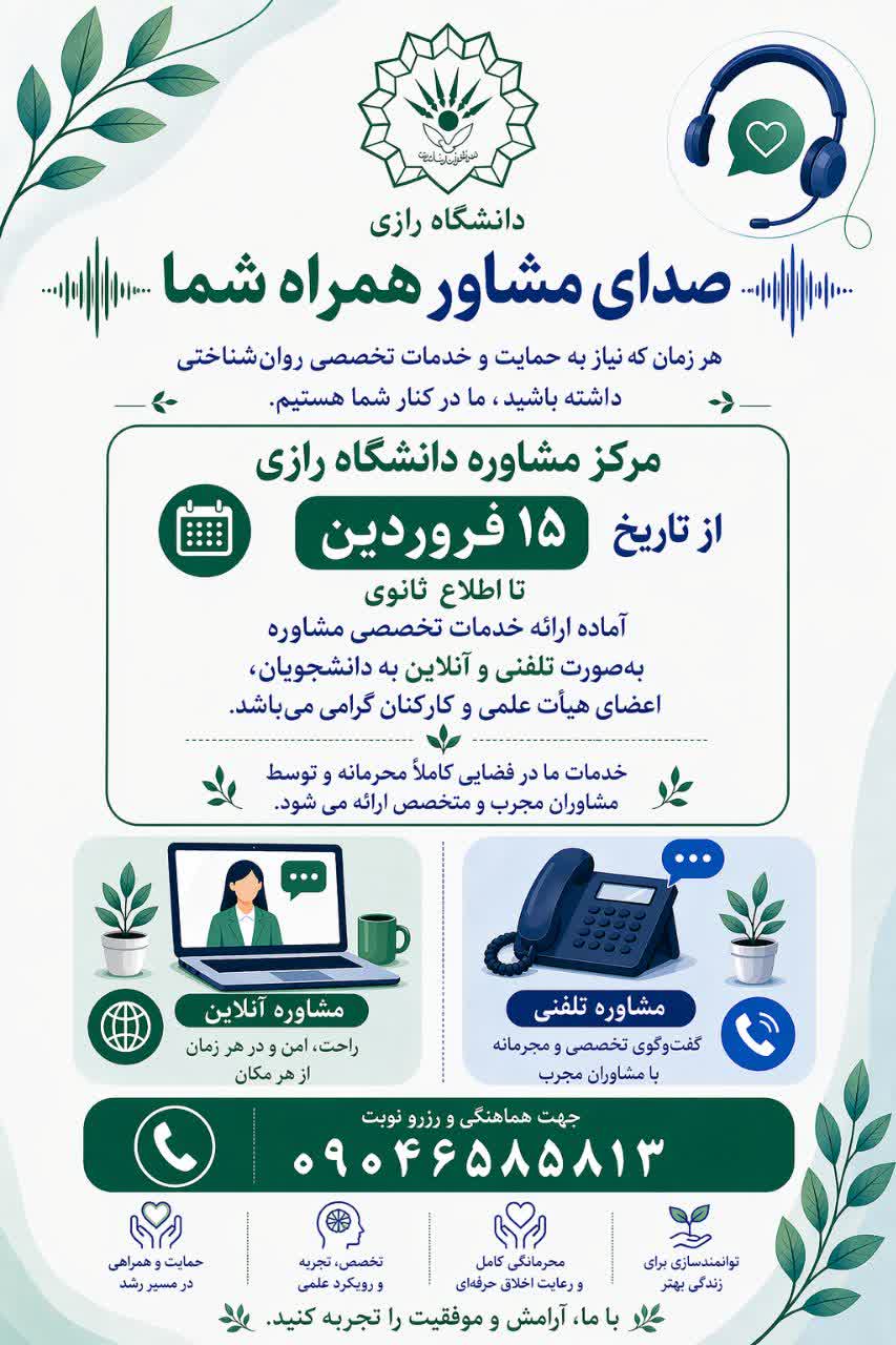مرکز مشاوره دانشگاه رازی با درک شرایط خاص جامعه و افزایش فشارهای روانی ناشی از وضعیتهای بحرانی و جنگی، در راستای حفظ و ارتقای سلامت روان دانشگاهیان، از تاریخ ۱۵ فروردین تا اطلاع ثانوی ارائه خدمات تخصصی مشاوره به صورت تلفنی و آنلاین را آغاز نموده است.