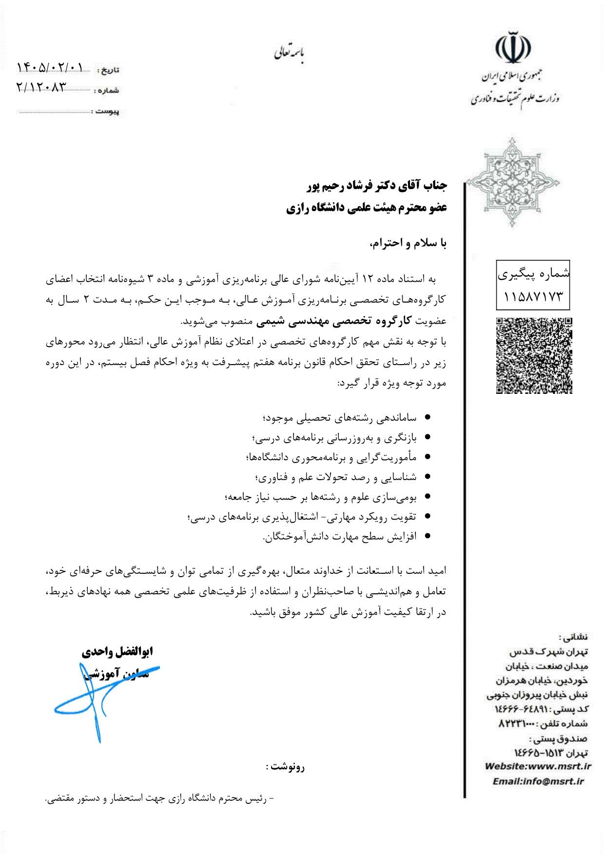طی صدور حکمی از سوی دکتر «ابوالفضل واحدی» معاون آموزشی وزارت علوم، تحقیقات و فناوری، دکتر «فرشاد رحیم پور» عضو محترم هیئت علمی دانشگاه رازی به مدت ۲ سال به عضویت کارگروه تخصصی مهندسی شیمی منصوب شد.