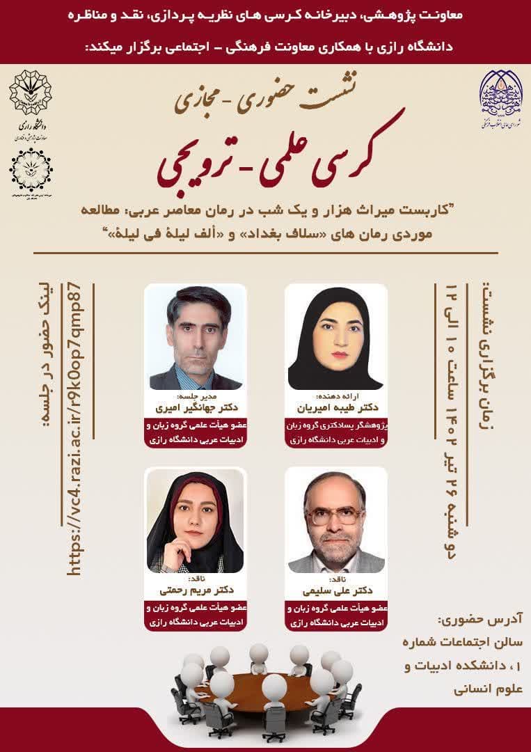 کرسی علمی_ ترويجي «کاربست میراث هزار و یک شب در رمان معاصر عربی (مطالعه موردی رمان های «سلاف بغداد» و «الفه لیلة في لیله»)